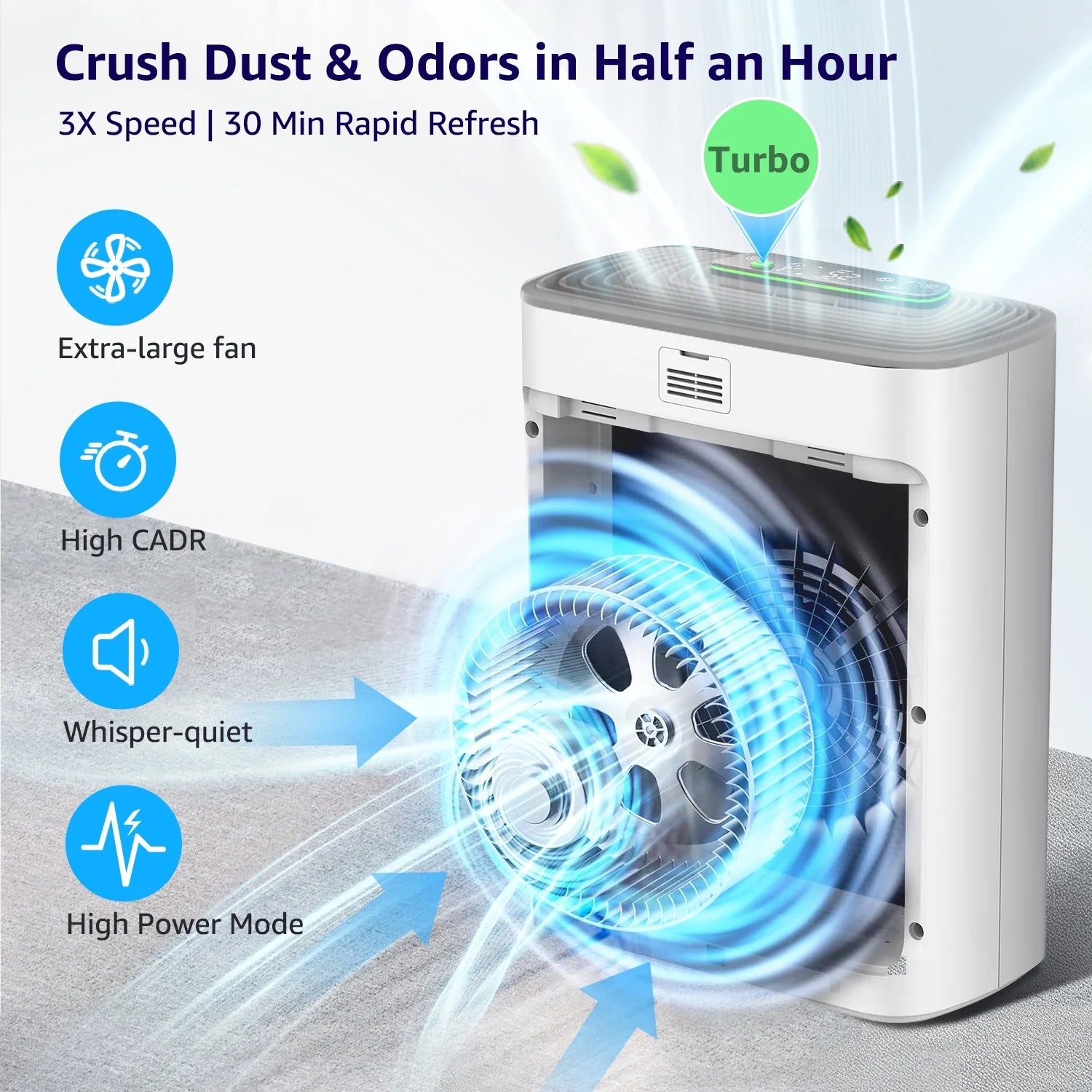 6 Purification Modes: Turbo mode, Auto mode, sleep mode, and 3 fan speeds